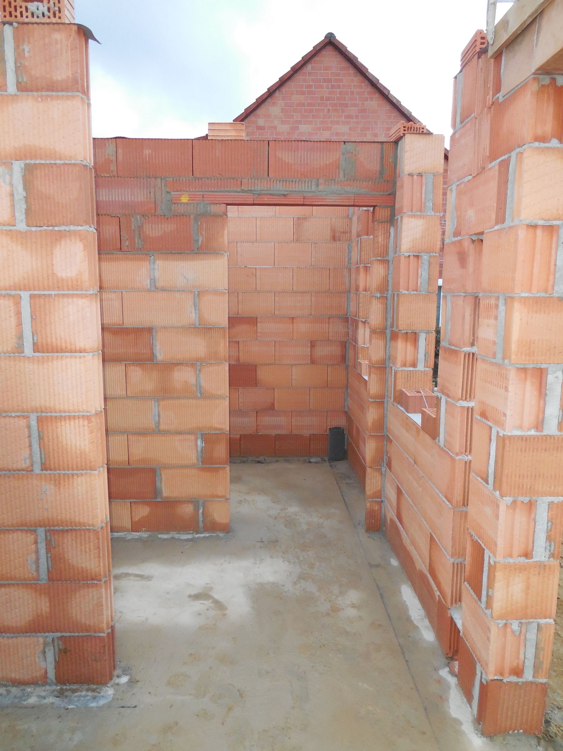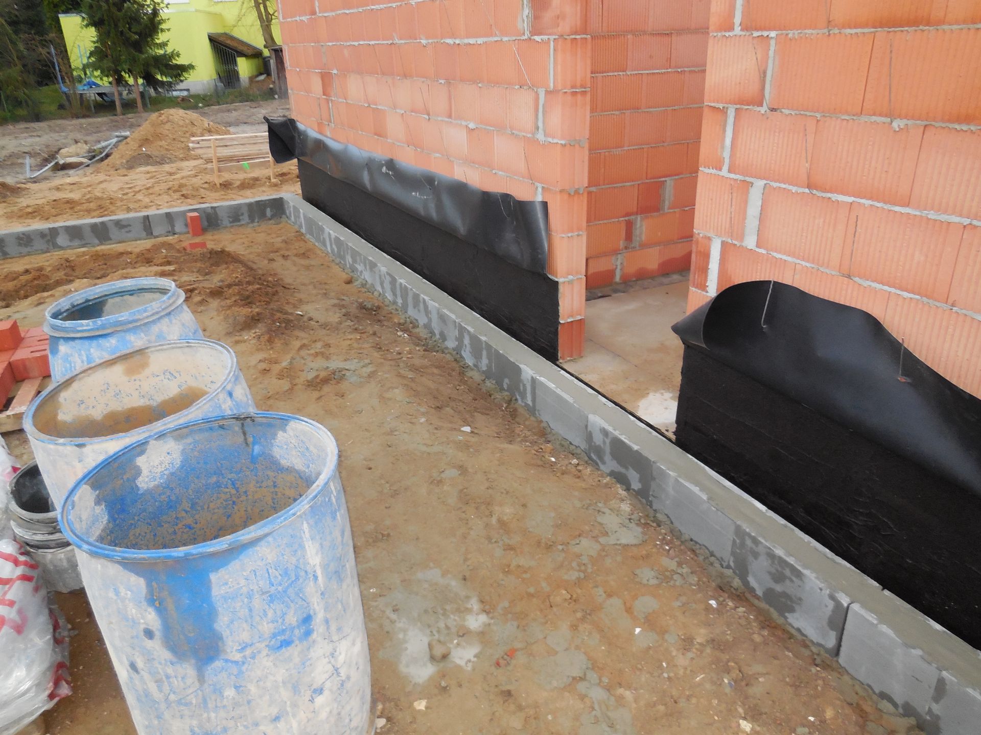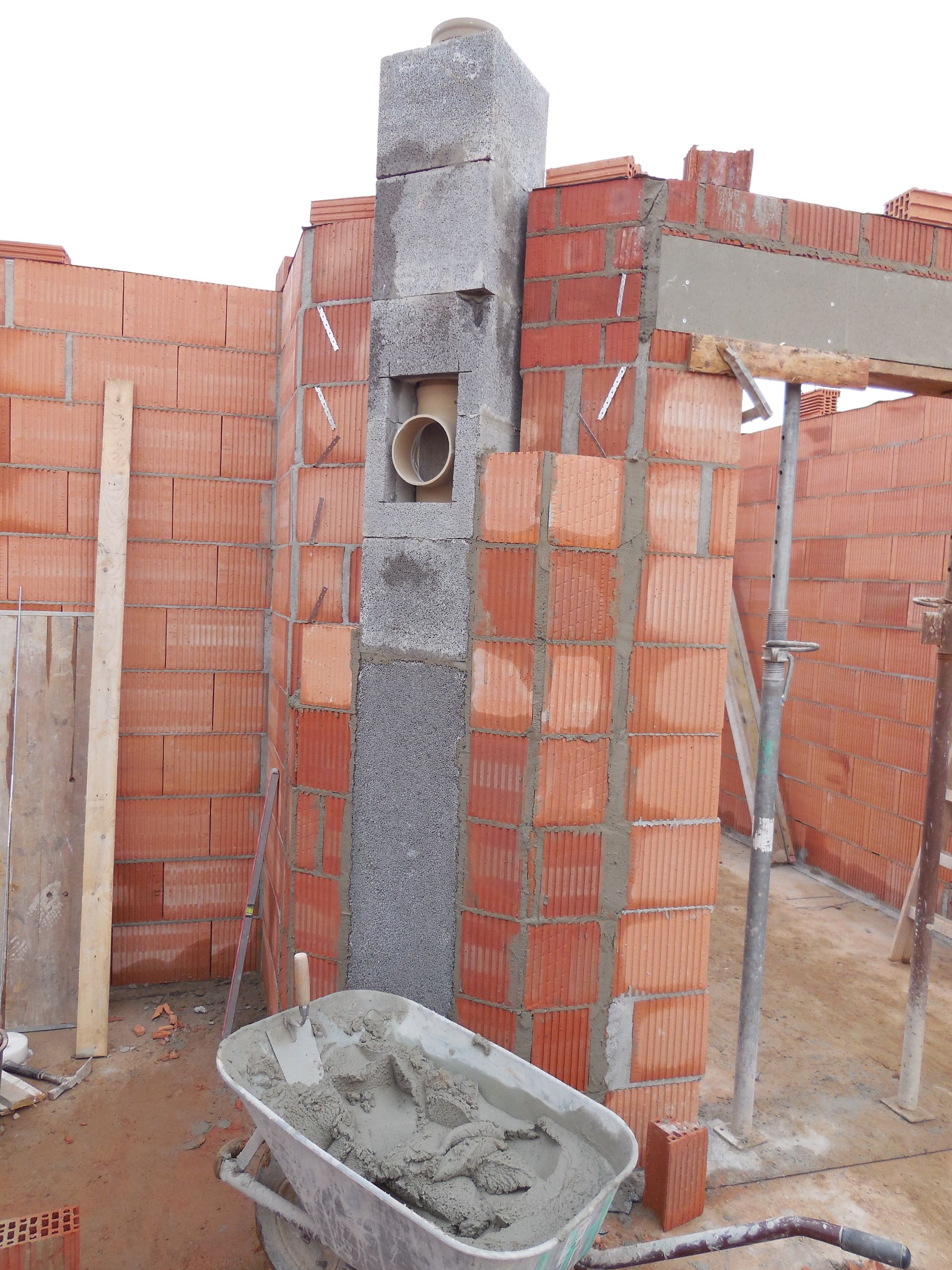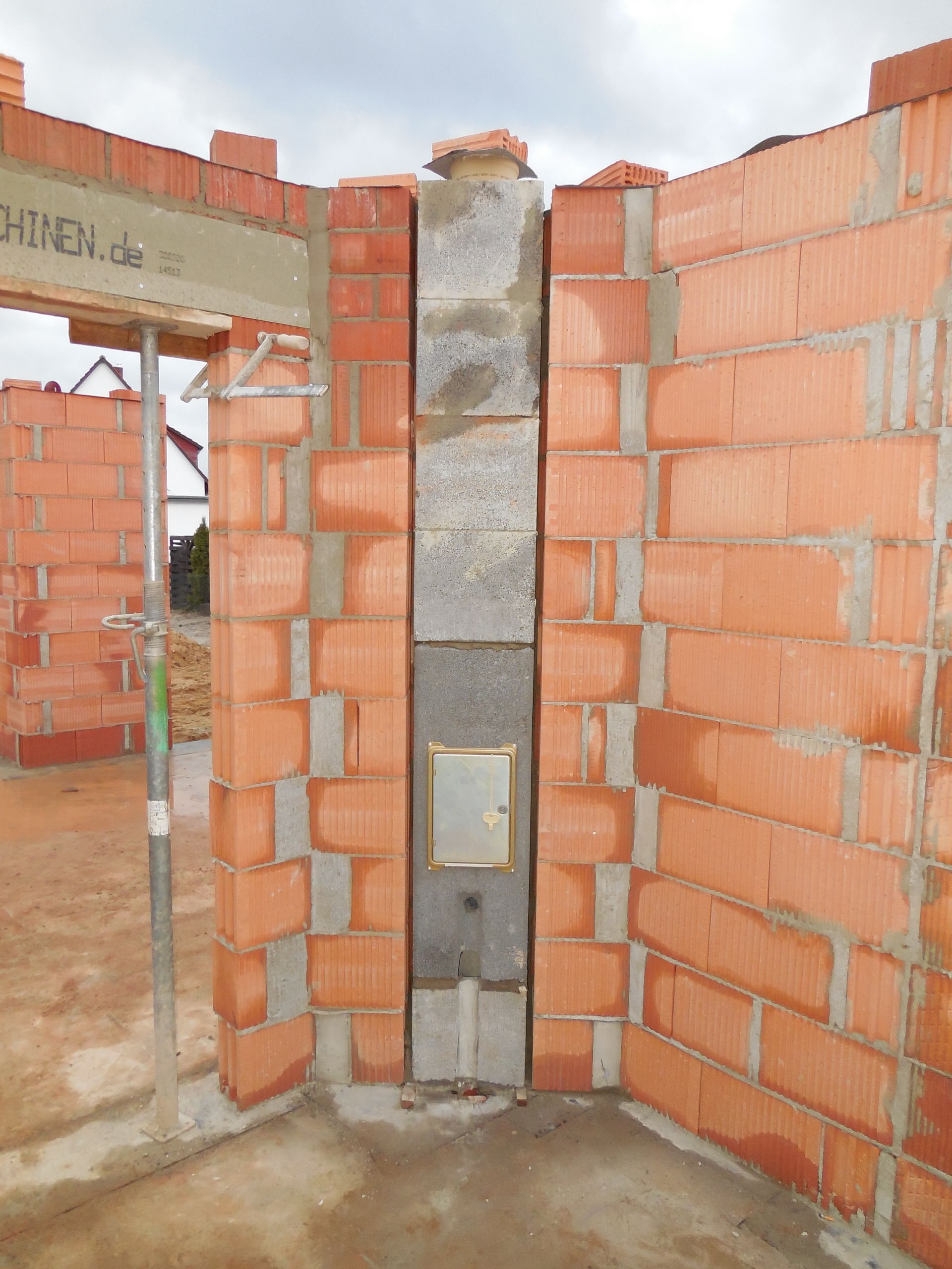 Heute wurden die Mauerarbeiten am Erdgeschoss fertig. Mit der Garage wurde begonnen, die Außenwand zwischen Garage und Haus wurde mit Bitumen versiegelt und der Kamin zwischen Wohnzimmer und Flur wurde eingebaut und ummauert.