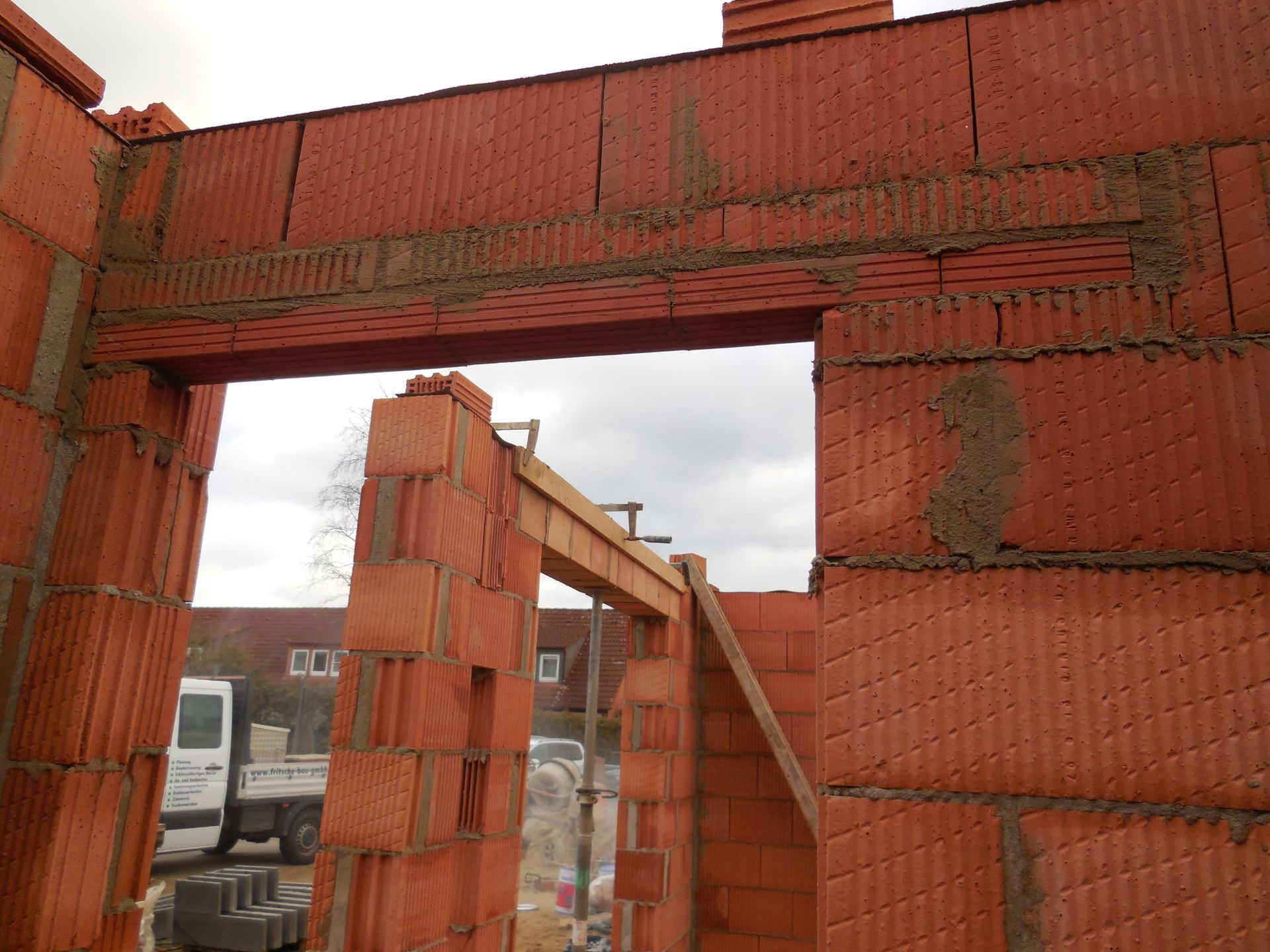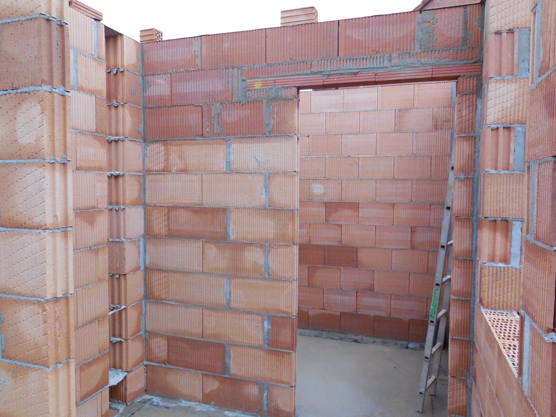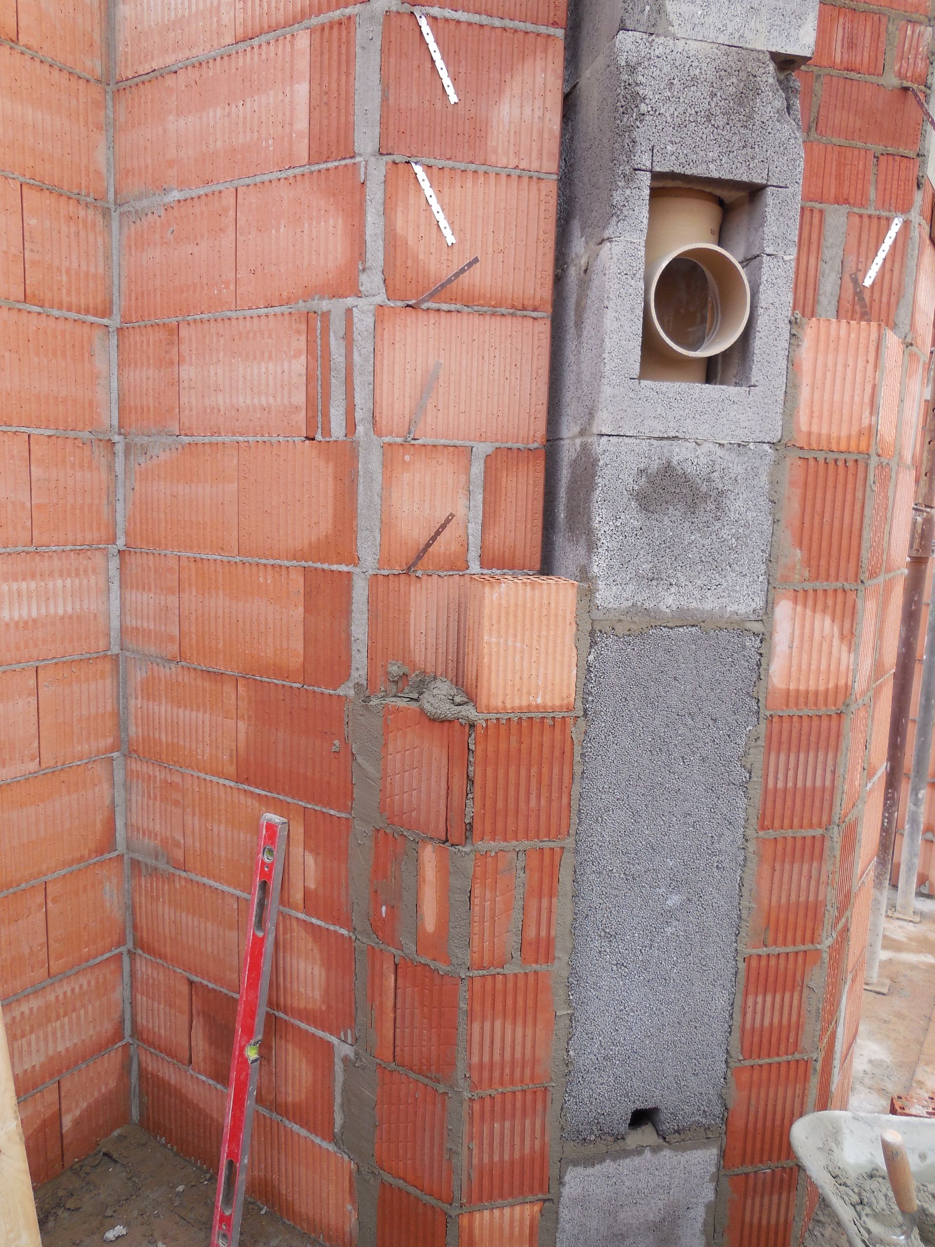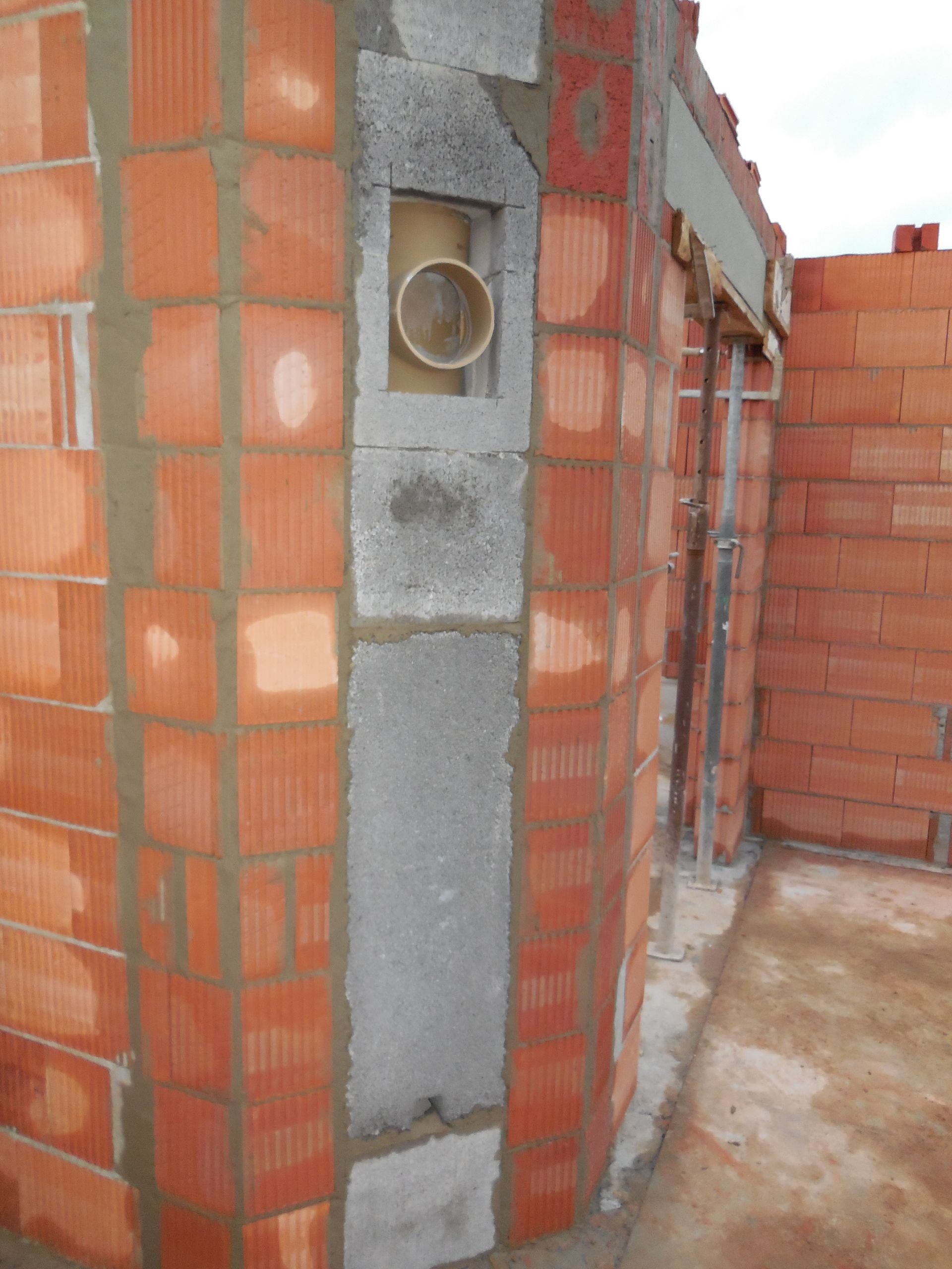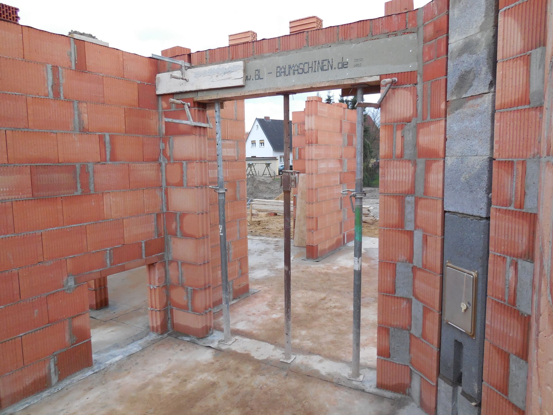 Heute wurden die Mauerarbeiten am Erdgeschoss fertig. Mit der Garage wurde begonnen, die Außenwand zwischen Garage und Haus wurde mit Bitumen versiegelt und der Kamin zwischen Wohnzimmer und Flur wurde eingebaut und ummauert.