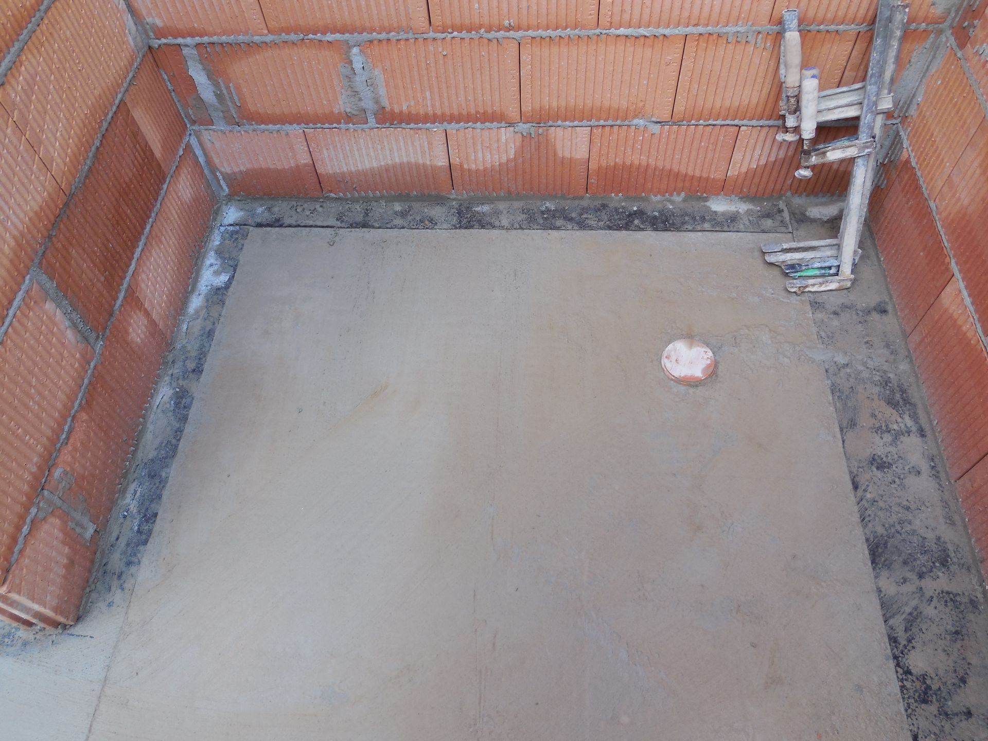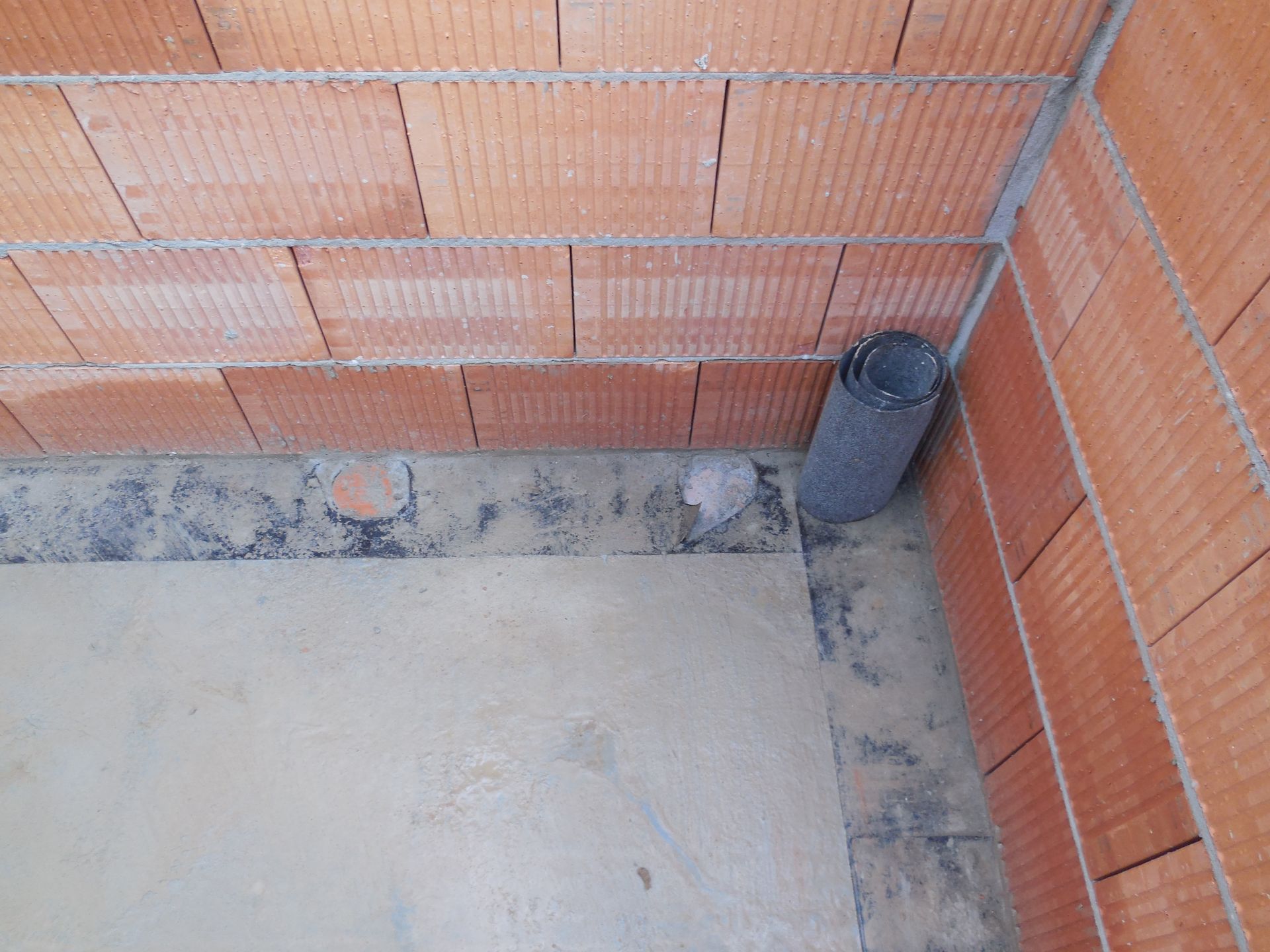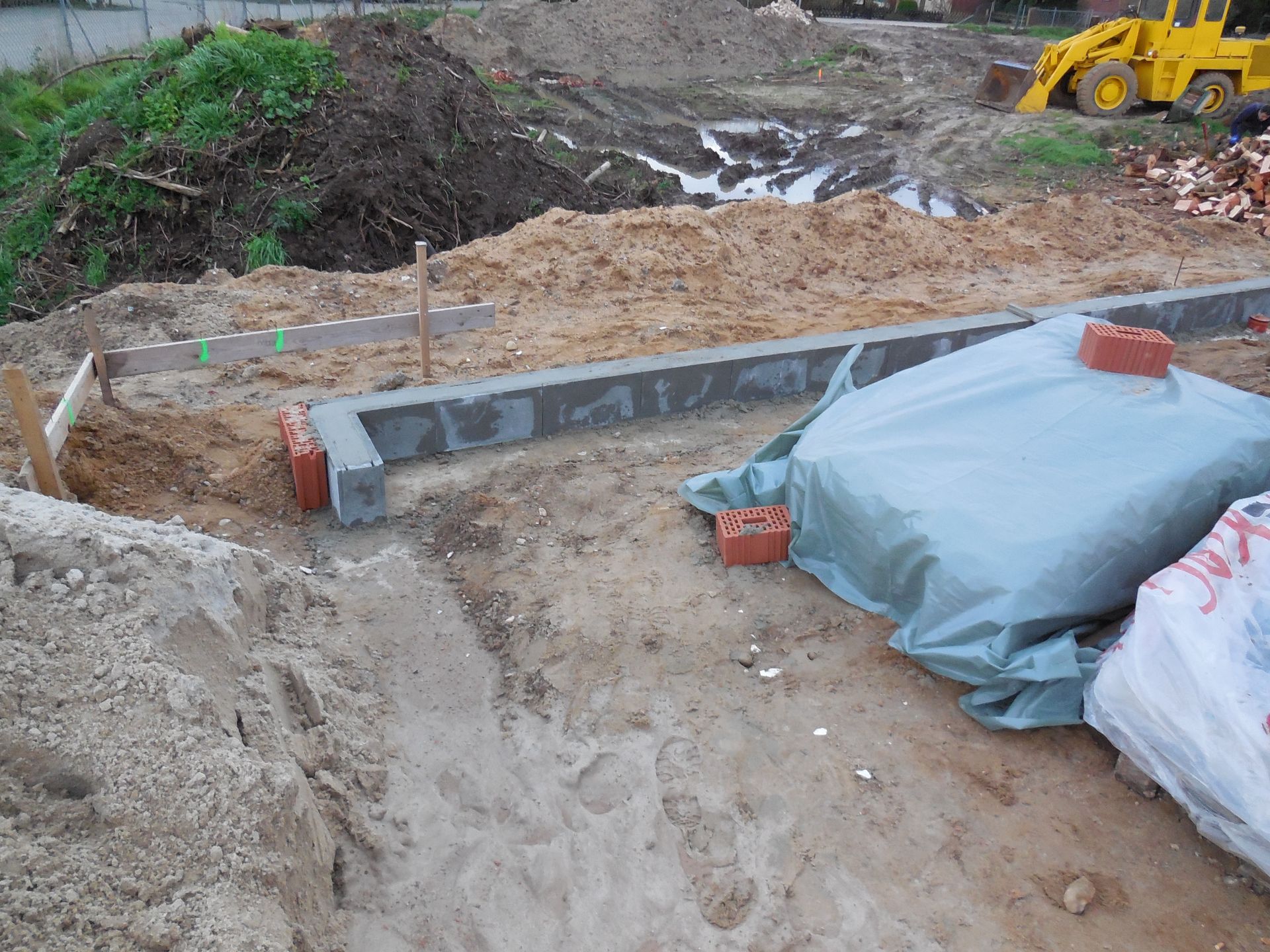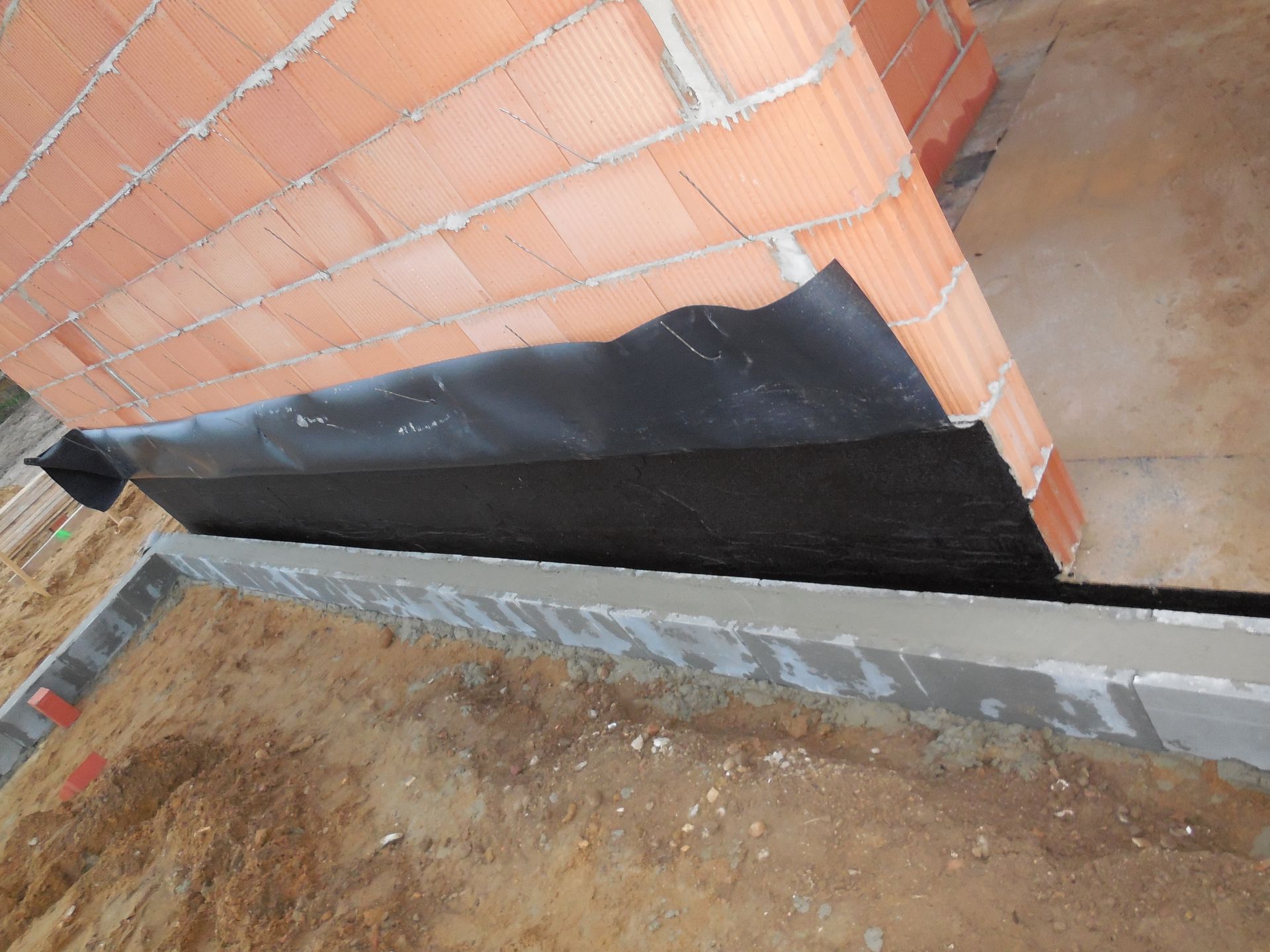 Heute wurden die Mauerarbeiten am Erdgeschoss fertig. Mit der Garage wurde begonnen, die Außenwand zwischen Garage und Haus wurde mit Bitumen versiegelt und der Kamin zwischen Wohnzimmer und Flur wurde eingebaut und ummauert.