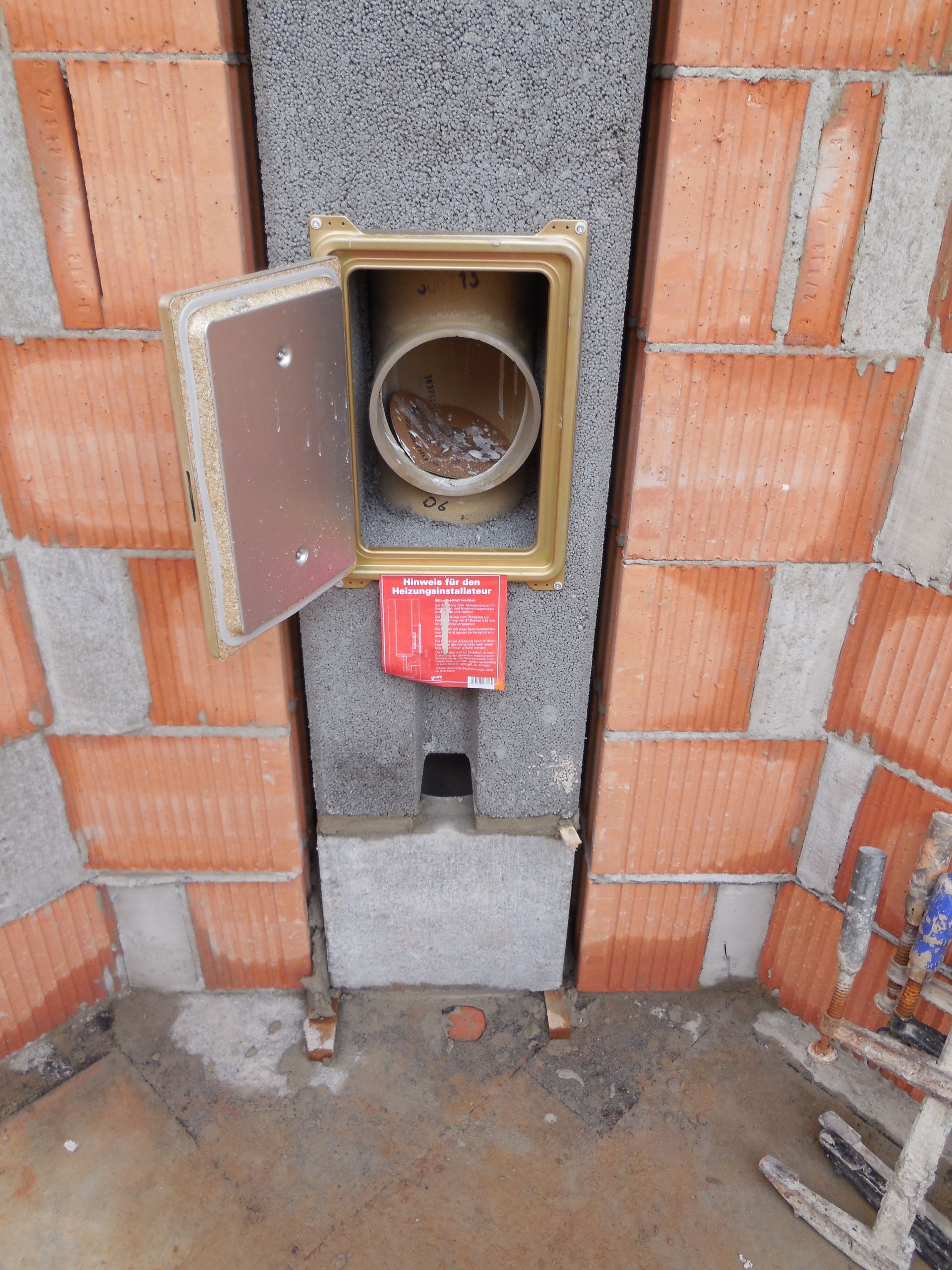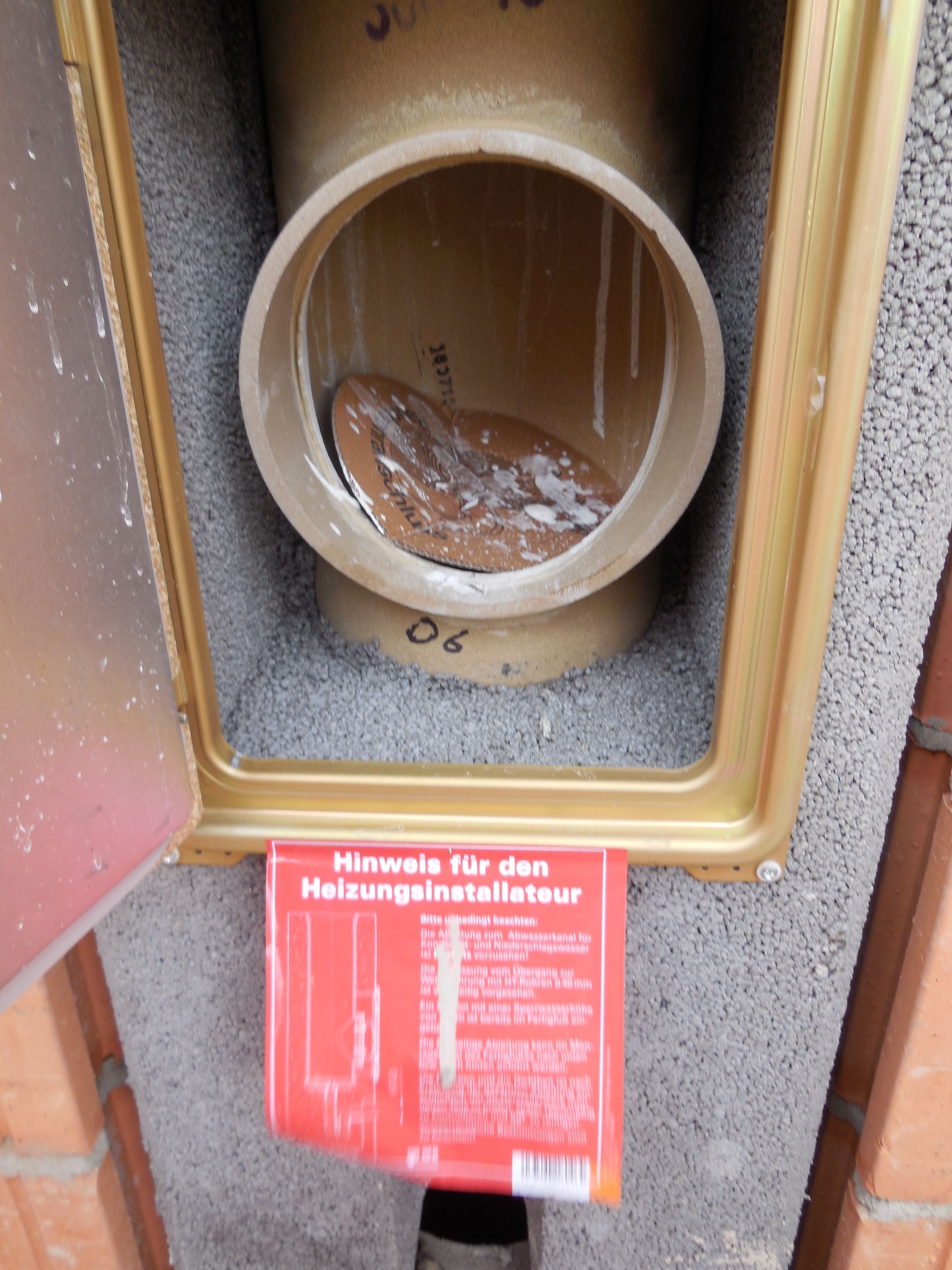 Bei dem Kamin handelt es sich um ein Baukastensystem der Firma Schiedel. Sieht soweit wir das beurteilen können richtig klasse aus das Ding. Durch den Einbau des Kamins in die Wand zwischen Wohnzimmer und Flur erhoffen wir uns, das wir – wenn er in Betrieb ist – auch den Flur unten und oben direkt mit angenehmer Wärme speisen können. Den Anschluss für das Rauchrohr haben wir auf 180cm über dem späteren Fussboden festgelegt. Das gibt uns die Möglichkeit so ziemlich jede Art von Ofen anzuschließen. Was für ein Modell von Ofen wir letzten Endes nehmen werden steht noch in den Sternen. Ich persönlich bin Freund von Bullerjan, denn den kenn ich aus dem väterlichen Feriendomizil in der Tschechei / Marianske Lazne und das Ding ist der Wahnsinn was Effizienz und Leistung angeht aber mal sehen. Das hat auf jeden Fall noch Zeit. Damit wir genug Stellplatz für den Ofen haben, haben wir auf der Seite des Wohnzimmers den Ofen so ein wenig abgerundet und uns damit die Chance gelassen wirklich später mal entscheiden zu können ob es ein schmaler, breiter, hoher, niedriger, runder, eckiger Ofen werden soll. Weiterhin haben wir gleich in weiser Voraussicht eine Zuluftversorgung mit anschließen / einbauen lassen, die bei einem Ofenmodell das auf externe Zuluft angewiesen ist, dann dementsprechend geöffnet und angeschlossen werden kann. Die Zuluft kommt von der Wohnzimmer-Außenwand und verläuft unter dem Fußboden zum Kamin.